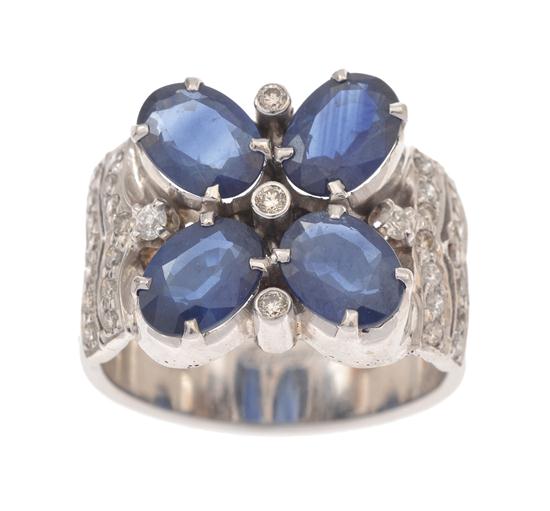 Of floral cluster design, comprising four oval sapphires with round brilliant cut diamond detail to the centre and shoulders, on a wide band, in 14ct white gold, ring size L-M.