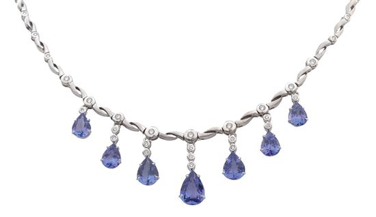 Set with seven pear cut tanzanite drops totalling 15.60cts, each surmounted by diamonds, to a fancy link diamond set collar, all in 18ct gold, independent valuation available.