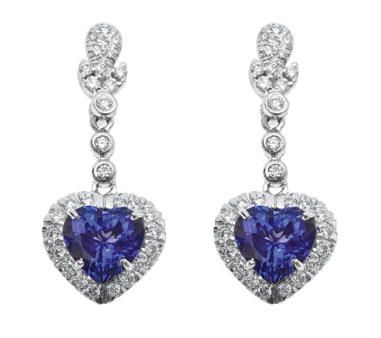 Each earring set with a heart shaped tanzanite weighing 3.0cts within a border of round brilliant cut diamonds, suspended on a diamond set drop and stud fitting, in 18ct white gold, independent valuation available.