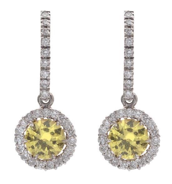 Of cluster design, each earring comprising a yellow sapphire within a border of round brilliant cut diamonds, suspended on a diamond set drop, to post and butterfly fittings, in 18ct white gold.