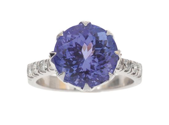 Centrally set with a round brilliant cut tanzanite weighing 6.15cts, with small brilliant cut diamonds to the coronet and shoulders, in 18ct white gold, independent valuation available, ring size L-M.