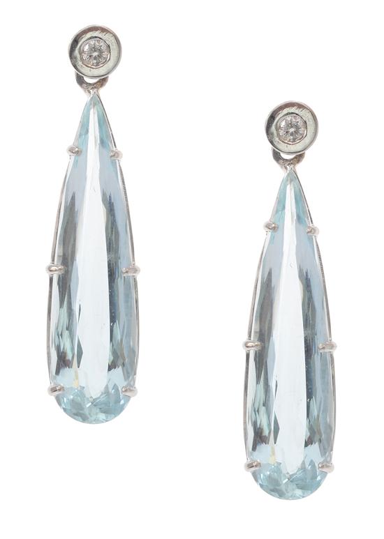 Each set with a pear cut aquamarine weighing 8.30cts, surmounted by a round brilliant cut diamond, to post and butterfly fittings, independent valuation available.