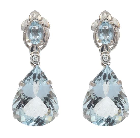 Each set with a pear cut aquamarine weighing 8.30cts, surmounted by a further oval aquamarine and round brilliant cut diamonds, to post and butterfly fittings, independent valuation available.