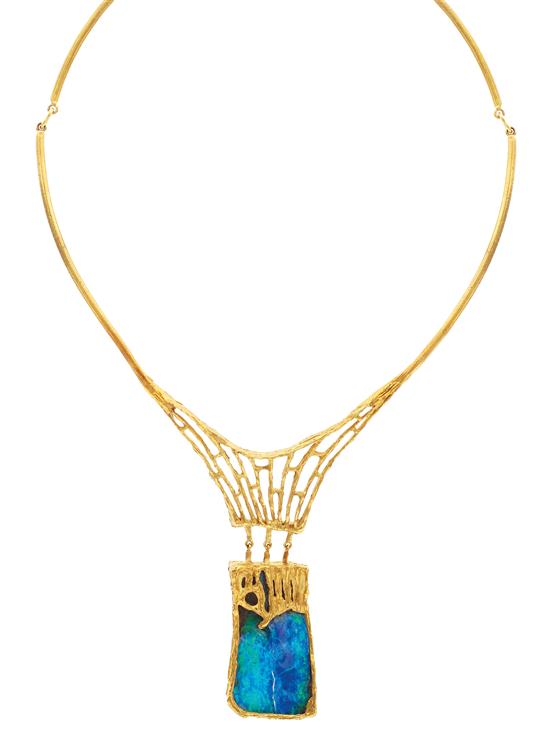 Comprising a freeform boulder opal set within an abstract mount suspended on a conforming articulated collar, in 18ct gold.