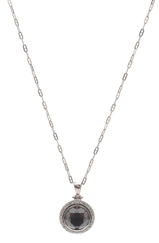 Centrally set with a black round brilliant cut diamond weighing 9.05cts, within a border of white diamonds, to a fancy link chain, all in 18ct white gold, independent valuation available.