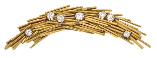 Of abstract crescent design randomly set with seven old European cut diamonds, in 18ct gold, marked B.J.P.