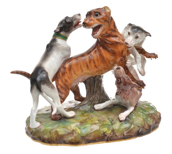 Figurative group depicting dogs attacking a tiger on a naturalistic base