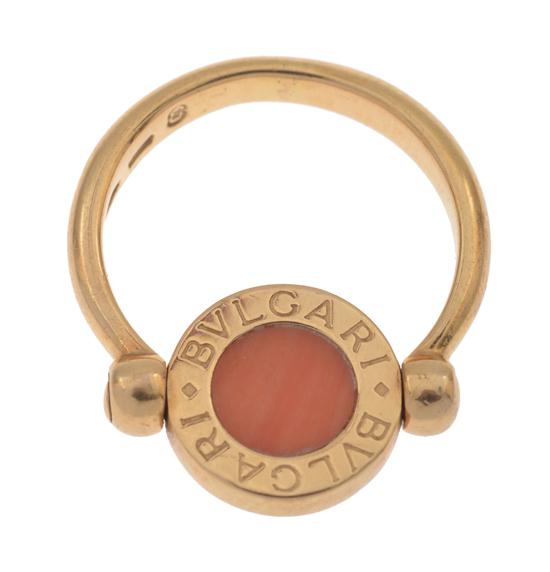 From the 'Bulgari' collection, one side set with onyx, the other with coral, within a gold surround, in 18ct gold, boxed with papers, ring size H-I.