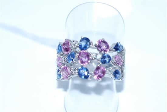 The wide band set with vari-cut pink and blue sapphires totalling 4.50cts, with round brilliant cut diamond detail, in 18ct white gold, ring size P-Q.