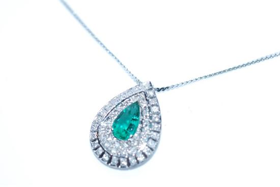 AN EMERALD AND DIAMOND PENDANT - Centrally set with a pear cut emerald weighing 1.30cts within a diamond set surround totalling 0.55cts, in 14ct gold, suspended on a snake chain in 9ct white gold.