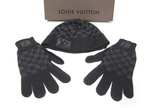 A LOUIS VUITTON KNITTED BEANIE AND GLOVES IN A GRAY DAMIER DESIGN