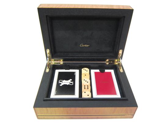 A SET OF CARTIER PLAYING CARDS IN A FIGURED WOOD BOX.
