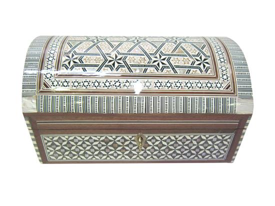 AN INLAID WOODEN DOME TOP JEWELLERY CASE