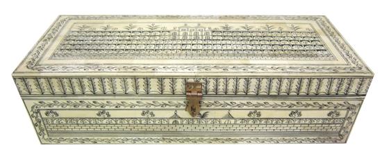 AN ANGLO INDIAN STYLE IVORY AND BLACK STAINED CASKET, WITH BRASS LOCK