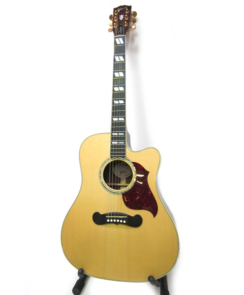 A GIBSON ACOUSTIC GUITAR, SONGWRITER DLX STUDIO, WITH A HARD CASE AND STAND.