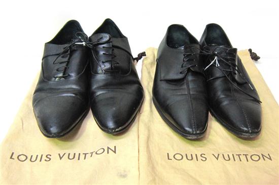 TWO PAIRS OF LOUIS VUITTON MENS BLACK LEATHER SHOES, ESTIMATED SIZE 10.