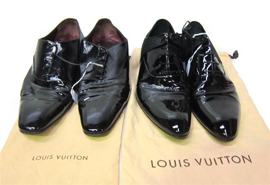 TWO PAIRS OF LOUIS VUITTON MENS BLACK PATENT LEATHER SHOES, ESTIMATED SIZE 10.