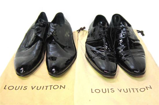 TWO PAIRS OF LOUIS VUITTON MENS BLACK PATENT LEATHER SHOES, ESTIMATED SIZE 10.