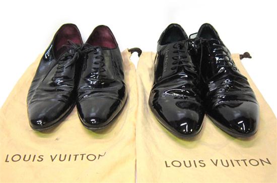 TWO PAIRS OF LOUIS VUITTON MENS BLACK PATENT LEATHER SHOES, ESTIMATED SIZE 10.