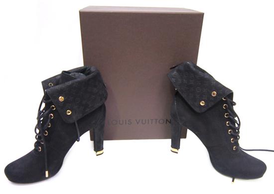 A PAIR OF LADIES LOUIS VUITTON ANKLE BOOTS WITH BOX, ESTIMATED EUROPEAN SIZE 40.