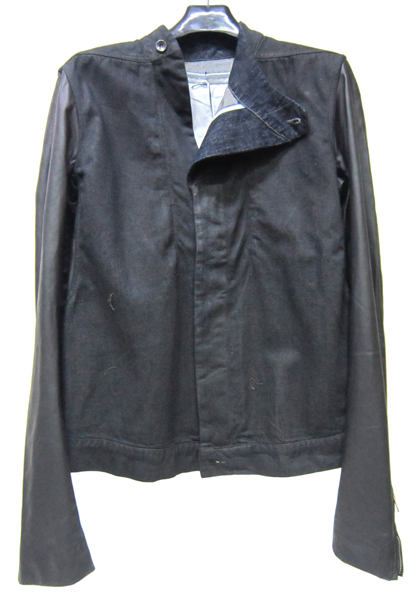A MENS OLMAR AND MIRTA LEATHER AND DENIM JACKET, ESTIMATED SIZE 102 / M-L.