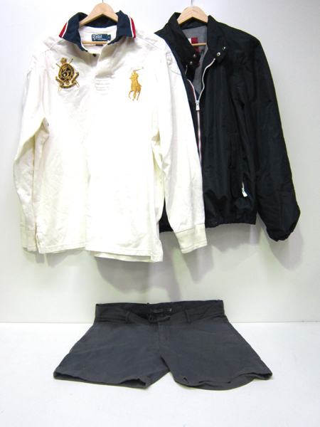 A POLO RALPH LAUREN RAIN JACKET AND A PAIR OF MENS SHORTS, ESTIMATED SIZE M-L.