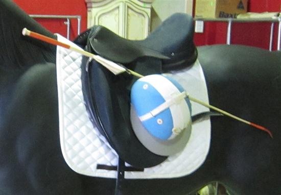 AN HERMES SADDLE, HERMES SALLIER PARIS, ID NUMBER 46071, STYLE CORLANDUS, SIZE 170, THIS LOT INCLUDES A WHIP AND A LA DOLFINO POLO HAT.