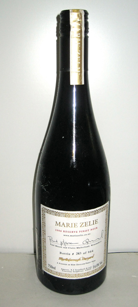 A BOTTLE OF MARIE ZELIE RESERVE PINOT NOIR, MARTINBOROUGH 2006 # 283/984 N Z, 750 ML