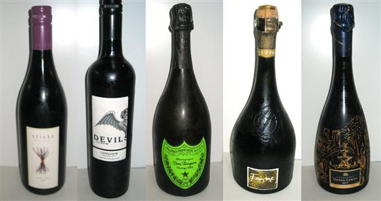 A SELECTION OF FIVE BOTTLES OF WINE INCLUDING DOM PERIGNON 2002 CHAMPAGNE.