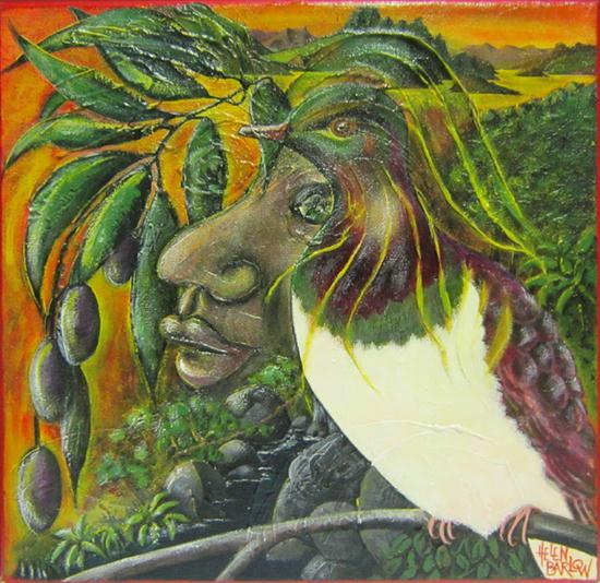 HELEN BARLOW, "PERSON WITH BIRD", OIL ON CANVAS, 30 CM X 30 CM