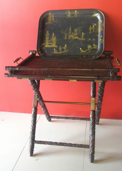 A WOODEN FOLDING "BUTLER'S " TABLE, WITH BRASS MOUNTS & REMOVABLE EBONISED TRAY IN THE JAPANESE TASTE.