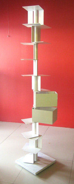 A CONTEMPORARY FLOOR STANDING CD/DVD RACK ON A MARBLE STAND.
