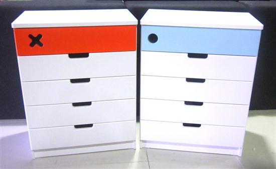 A PAIR OF "X O" CHEST OF DRAWERS, FIVE DRAWERS WITH A LAMINATE FINISH.