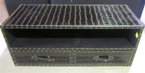 A BLACK LEATHER TRUNK, WITH TOP SHELF, TWO DRAWERS, HANDLE TO ONE DRAWER REQUIRES REPAIR.