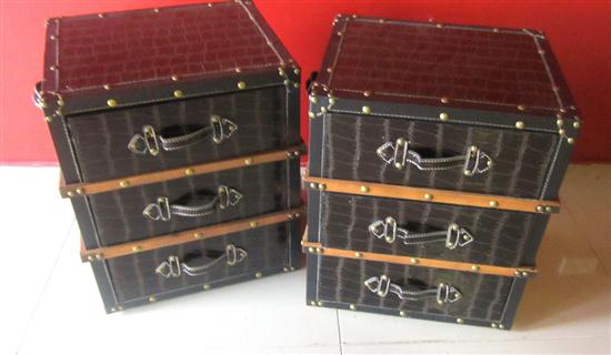 A PAIR OF BLACK LEATHER TRUNK STYLE THREE TIER BEDSIDE DRAWERS, 47CM HIGH X 40CM WIDE.