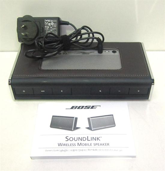 A BOSE SOUNDLINK, WIRELESS MOBILE SPEAKER, WITH LEATHER CASE.