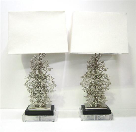 A PAIR OF SILVER PLATED CORAL LAMPS WITH SHADES.