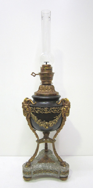 A DECORATIVE ORMOLU LAMP WITH TRI-FOOTED STAND ON MARBLE PLINTH.