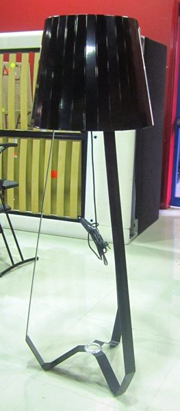 A BLACK GLOSS STANDARD LAMP ON TRIANGULAR BASE.