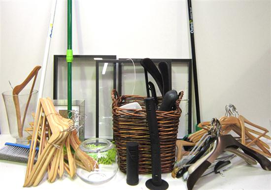 A SELECTION OF HOMEWARE ITEMS INCLUDING COAT HANGERS, VASES AND BROOM.