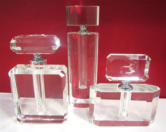 THREE CUT GLASS CONTEMPORARY PERFUME BOTTLES.