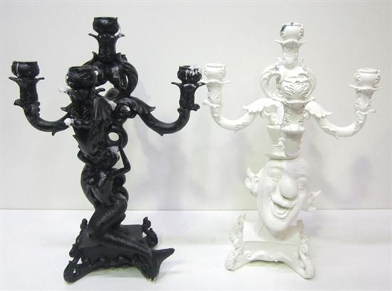 TWO CANDELABRA, ONE BLACK AND ONE WHITE.