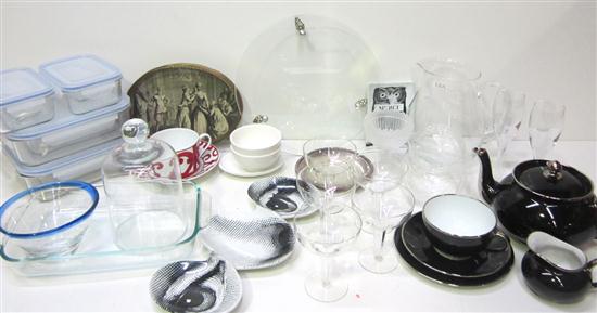 A VARIETY OF KITCHENWARE ITEMS INCLUDING BLACK TEAPOT.