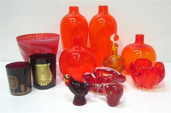 A COLLECTION OF ORANGE ART GLASS VASES.