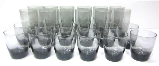 A SELECTION OF DARK GLASS DRINKING GLASSES.