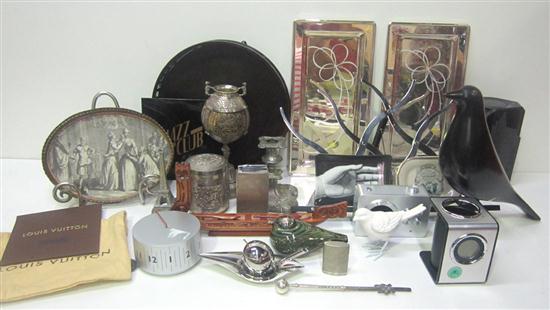 A SELECTION OF DECORATIVE ITEMS INCLUDING TRAYS AND FIGURINES.