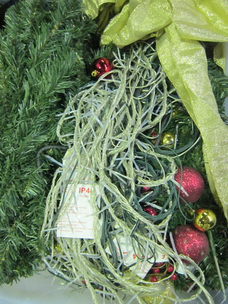 A CHRISTMAS TREE WITH LIGHTS AND DECORATIONS.