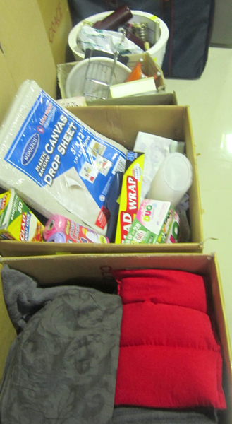 FOUR BOXES OF ASSORTED HOMEWARES INCLUDING PLANTER AND SUITCASE.