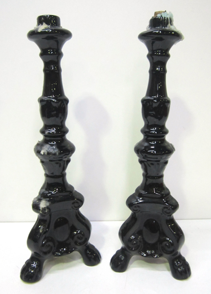 A PAIR OF BLACK PORCELAIN CANDLE STICKS.