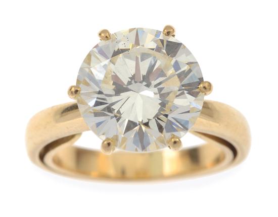 The round brilliant cut diamond weighing 5.10cts, in a six claw setting, in 18ct gold, independent valuation available, ring size L-M.